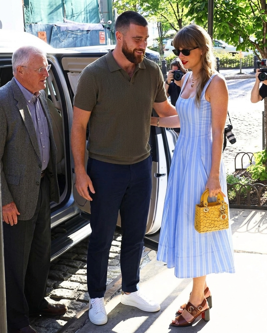 She wasn’t alone. By her side were her father, Scott Swift, and fiancé Travis Kelce, forming a trio that quickly became the center of a buzzing crowd. Eyewitnesses described the outing as relaxed yet electric, with fans gathering just to catch a glimpse of the chart-topping icon enjoying a quiet moment in the city.