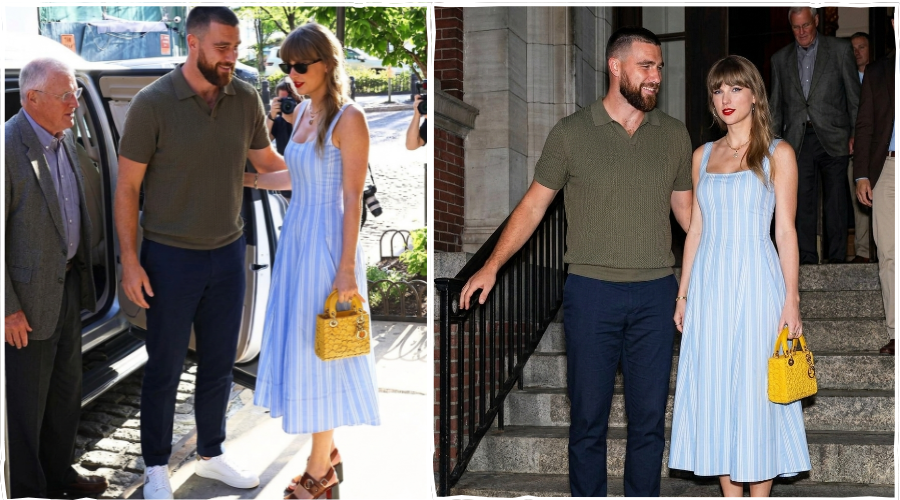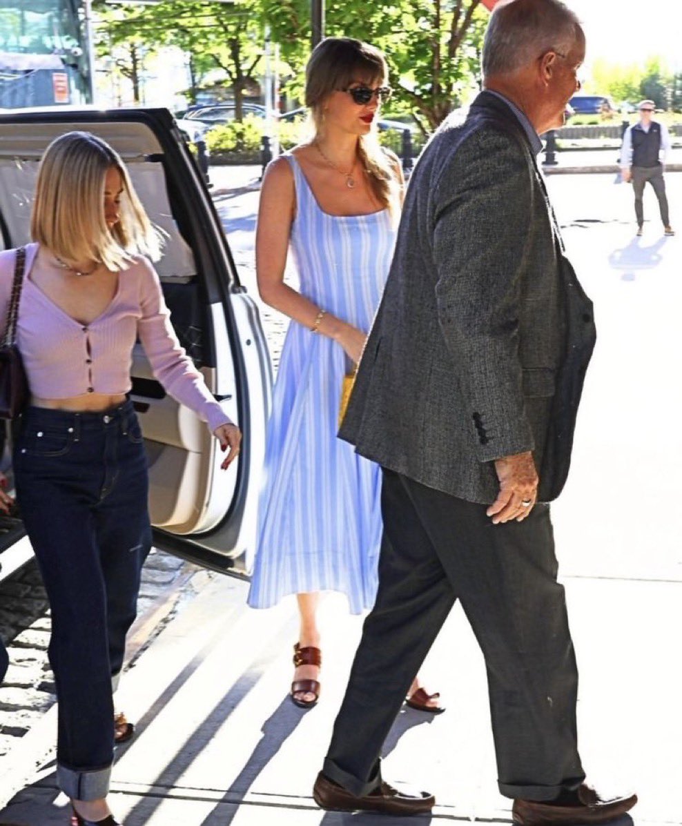 JUST IN: Taylor Swift looking spring-chic in a blue striped dress as she stuns San Vicente West Village in NYC with her dad, Scott Swift and fiance Travis Kelce But Fans Notice One Curious Detail.