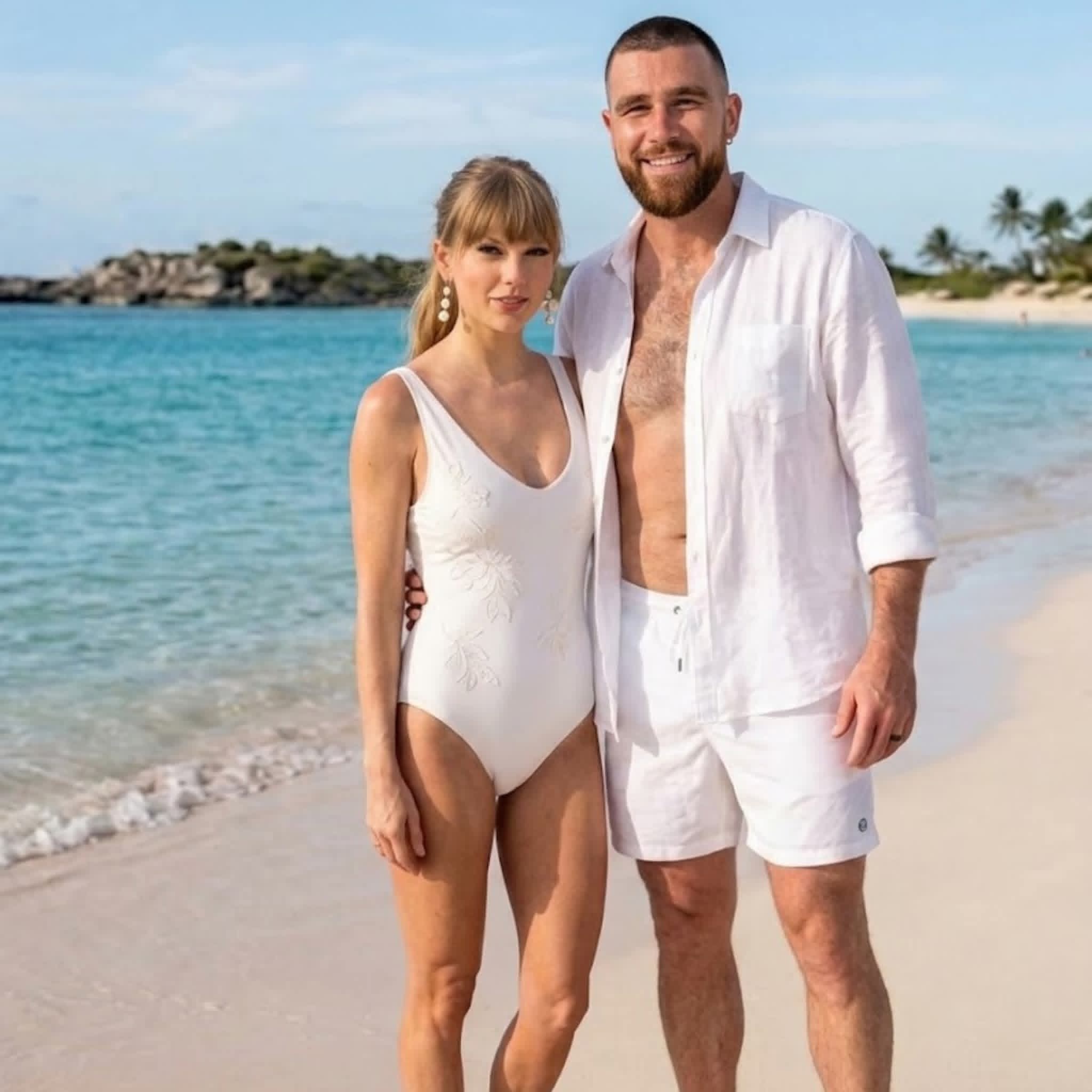 In a jaw-dropping turn that has sent social media into overdrive, global pop superstar Taylor Swift has unleashed a stunning series of beach photos wearing a barely-there white thong bikini — and she looks absolutely radiant alongside her NFL star husband, Travis Kelce.